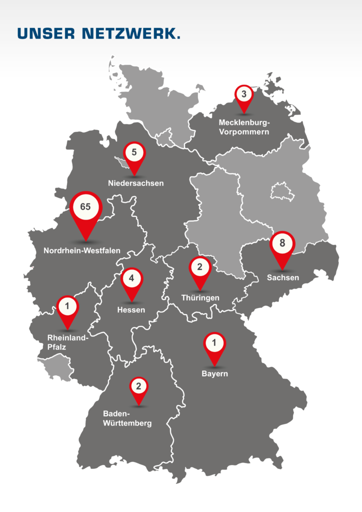 Aachen-Eilendorf, Aachen-Frankenberg, Ahaus-Alstätte, Ahaus-Wüllen, Bad Berleburg, Bedburg-Hau, Bochum, Bonn, Bottrop, Breidenstein, Coesfeld, Datteln, Dormagen, Dorsten, Dortmund-Hafen, Dortmund-Mitte, Dresden, Duisburg-Homberg, Duisburg-Meiderich, Duisburg-Rheinhausen, Duisburg-Wanheim, Dülmen, Düren, Düsseldorf-Eller, Düsseldorf-Lierenfeld, Düsseldorf-Rath, Emsdetten, Essen-Kettwig, Essen-Rellinghausen, Essen-Vogelheim, Freital, Geldern, Gelsenkirchen, Gemmingen, Gemünden, Gevelsberg, Greiz, Greven, Grevenbroich, Hagen-Eckesey, Hagen-Haspe, Hattingen, Heinsberg, Herne, Herten, Hilden, Hoya, Iserlohn, Jülich, Kaliss, Kamp-Lintfort, Kevelaer, Korbach, Korbach Drive In, Krefeld-Bockum, Krefeld-Dießem, Linz, Marktredwitz, Marl, Meerbusch, Metelen, Mönchengladbach-Pesch, Münster-Nord, Münster-Süd, Neuenkirchen, Neustadt-Glewe, Neuss-Grimlinghausen, Neuss-Hafen, Niederzier, Ottendorf, Pirna-Elbe, Pirna-PEZ, Rathmannsdorf, Reinheim, Rheine, Rodewisch, Schermbeck, Schriesheim, Schüttorf, Steinfurt, Schweindorf, Stolpen-Helmsdorf, Tönisvorst, Upahl, Verden, Viersen, Waltrop, Wegberg, Wunstorf, Witten, Wuppertal, Zeulenroda